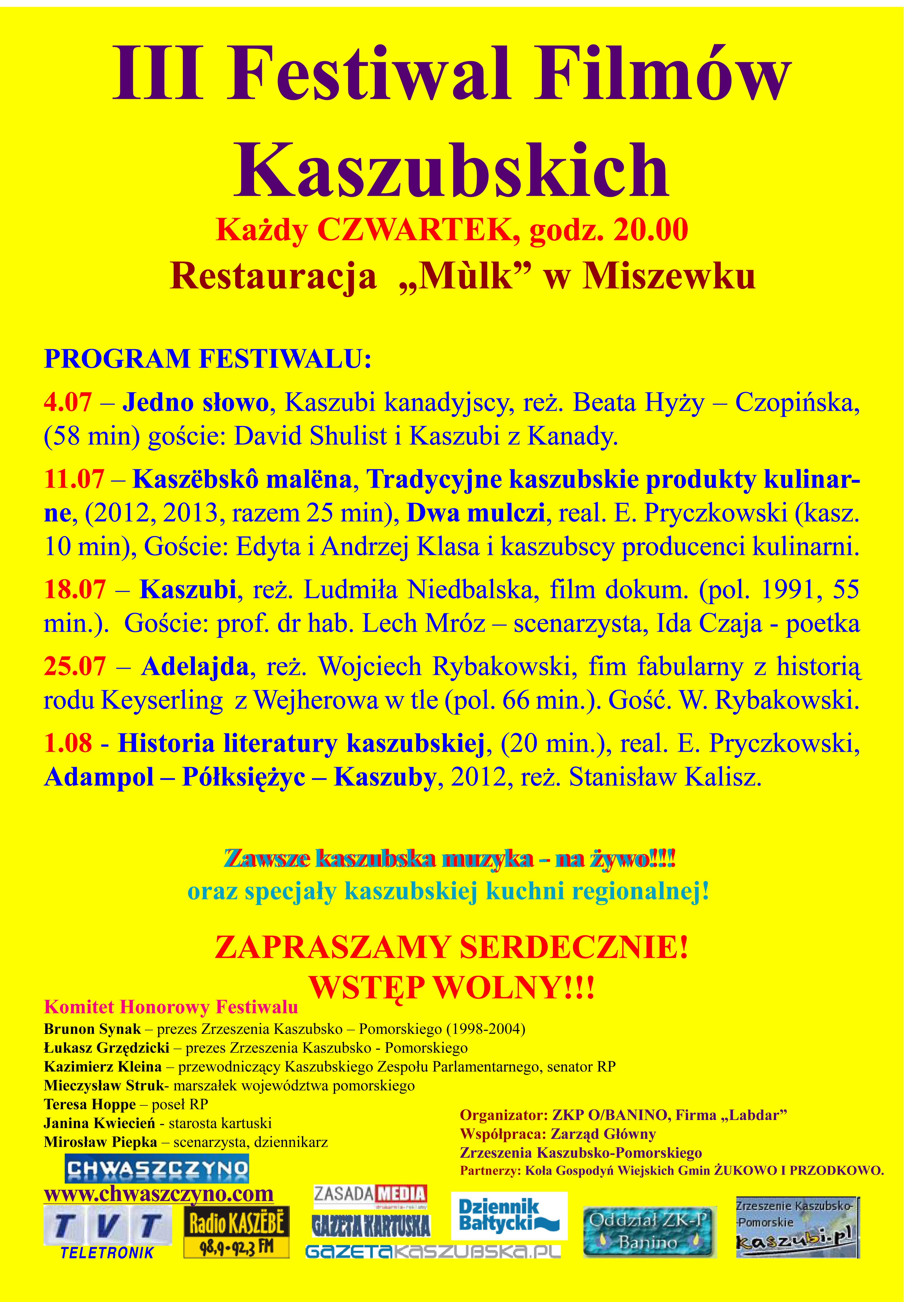Przed nami wielkie wydarzenia filmowe! Wzorem lat ubiegłych odbędzie się III Festiwal Filmów Kaszubskich. Jako pierwszy wyemitowany zostanie seans "Jedno słowo" o Kaszubach w Kanadzie. To spotkanie już zanosi się na wielkie wydarzenie. Obecni będą właśnie Kaszubi z Kanady. W tym dniach ojczyznę przodków odwiedza dwunastu mieszkańców Kraju Klonowego Liścia na czele z Davidem Shulistem, którzy będą wędrować ścieżkami swoich prapradziadków. Jednym z punktów ich pobytu będzie właśnie obecność na Festiwalu. Swoją obecność także potwierdził senator Kazimierz Kleina - przewodniczący Kaszubskiego Zespołu Parlamentarnego. Przybędą także inni znamienici goście.