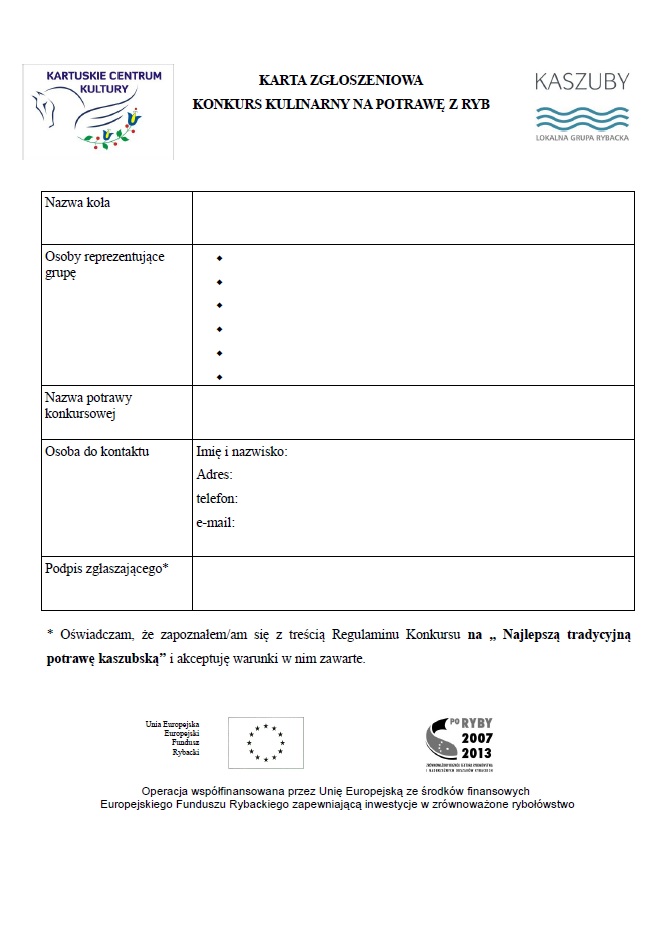 - Udzielenie Kartuskiemu Centrum Kultury w Kartuzach i Lokalnej Grupie Rybackiej Kaszuby nieodwołalnego i nieodpłatnego prawa wielokrotnego wykorzystywania zdjęć i nagrań z wizerunkiem uczestników konkursu bez konieczności każdorazowego ich zatwierdzania. Zgoda obejmuje wykorzystanie, utrwalanie, obróbkę i powielanie wykonanych zdjęć, za pośrednictwem dowolnego medium wyłącznie w celu zgodnym z prowadzoną przez Organizatorów działalnością.